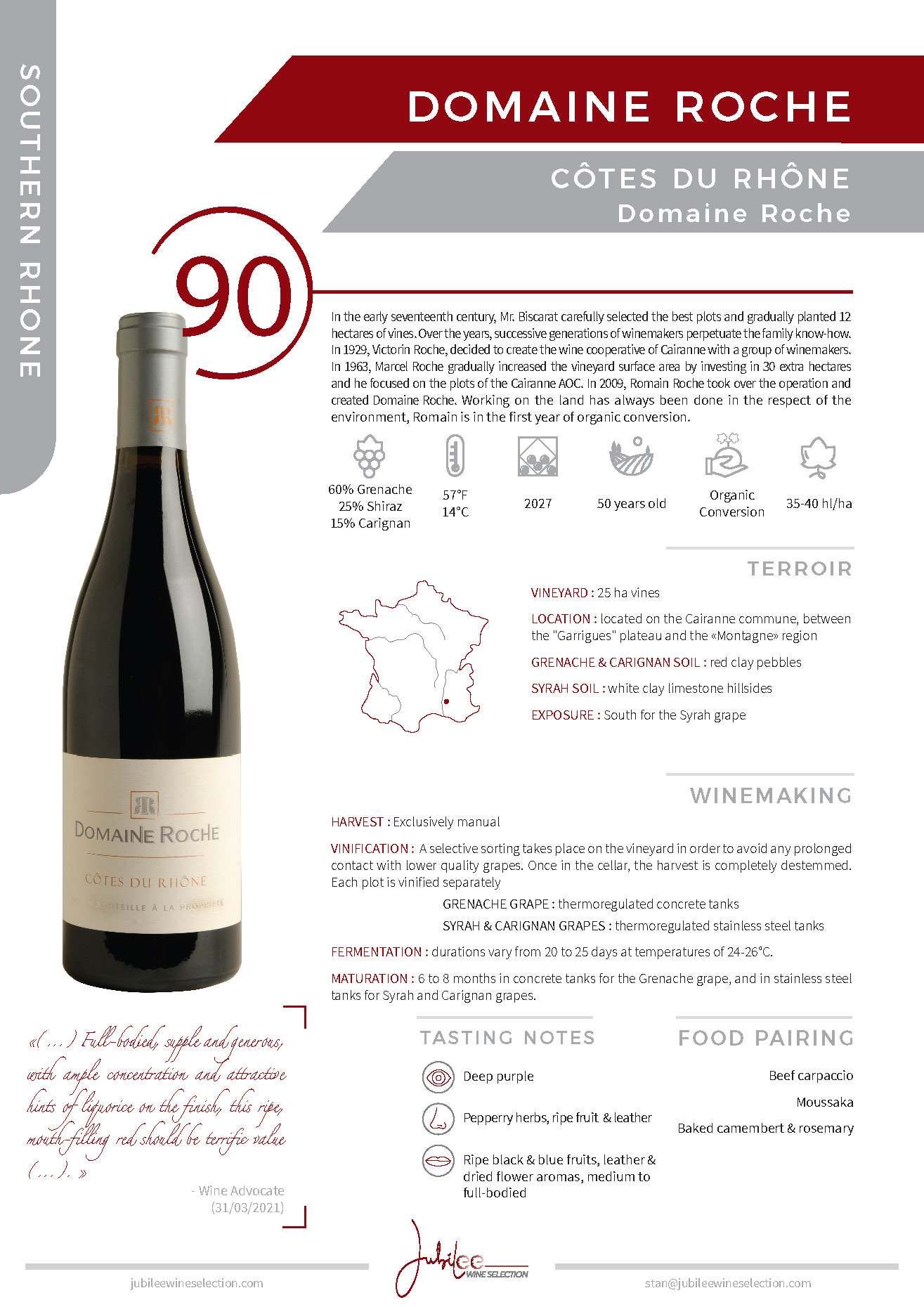 | Varietal: | 50%Grenache, 25% Syrah, and 25% Carignan |